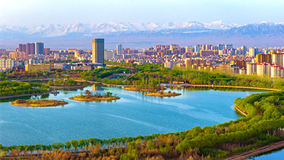 甘肃省张掖市甘州区润泉湖公园碧水蓝天、翠柳成荫、春意盎然,与城市楼群和祁连雪峰交相辉映。