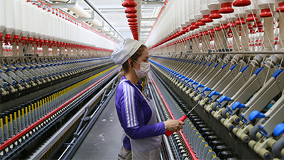 在新疆阿克苏地区阿瓦提县阿瓦提镇库木巴格社区的新疆华豫纺织科技有限公司纺织车间内,工人们正加紧作业。