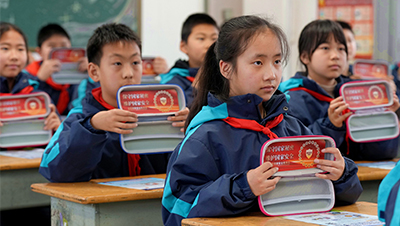 全民国家安全教育日,江苏省海安市滨海新区角斜小学的学生展示蕴含国家安全知识的文具盒。