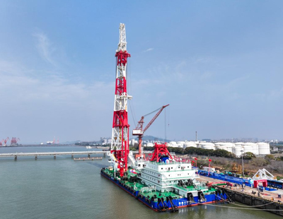 9月19日,工人操作机械设备在江苏省连云港市灌西盐场盐田进行活碴作业(无人机照片)。