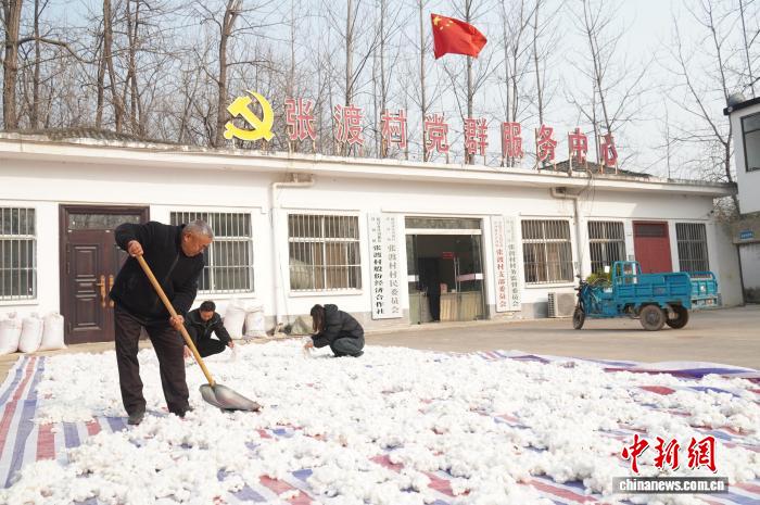 冬至过后,天气日渐寒冷,但江苏省宿迁市洋河新区洋河镇张渡村党群服务中心门前却暖意融融。阳光下,满地雪白的棉花蓬松柔软,几名村居工作者正娴熟地翻动、整理棉絮,空气中弥漫着淡淡的棉香。这些棉花正是张渡村与宿迁市农业科学研究院携手探索的棉花大豆带状复合种植模式结出的成果。