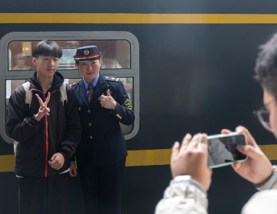 1月14日,旅客在杭州南站站台和Z100次列车合影。