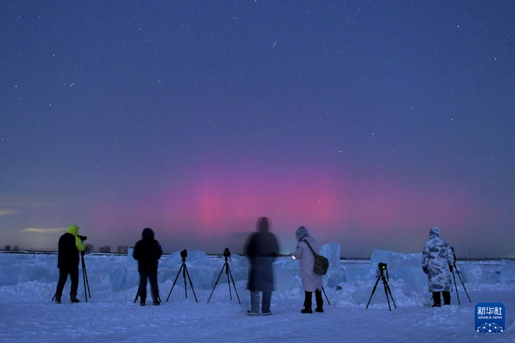 1月20日,在黑龙江省齐齐哈尔市,摄影爱好者在拍摄绚丽极光。