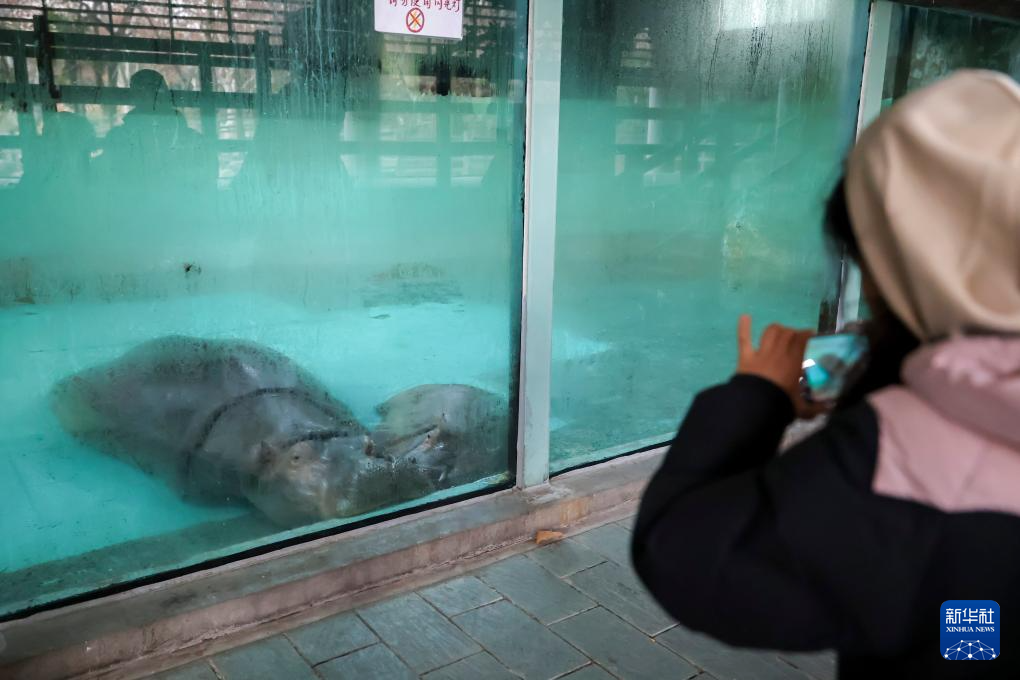 1月21日,游客拍摄在室内泡温泉的河马母子。