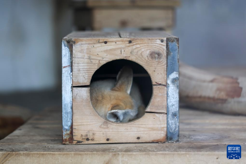 1月21日,耳廓狐在工作人员打造的小木屋内休憩。