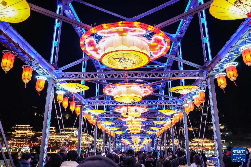 2月10日,甘肃省兰州市在兰州黄河铁桥中山桥、东方红广场等城市地标及城区主干道布置的灯饰灯组正式接电亮灯,营造出喜庆祥和的新春佳节氛围。