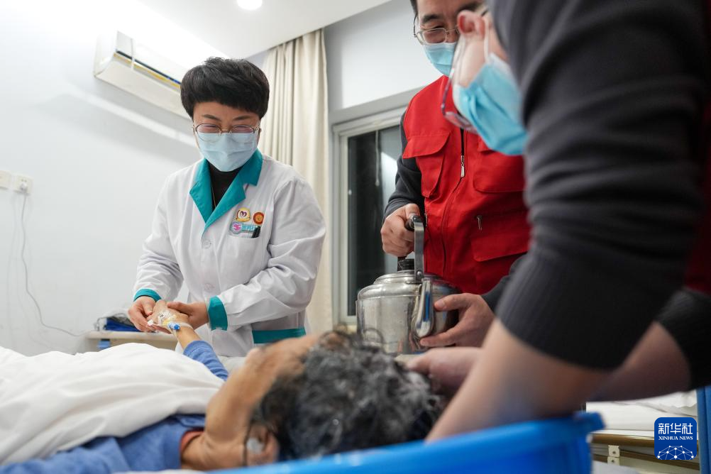 2月5日,在丰台区蒲黄榆社区卫生服务中心,医务社工郭翠红(左一)和志愿者在帮助一名70岁的癌症患者洗头。