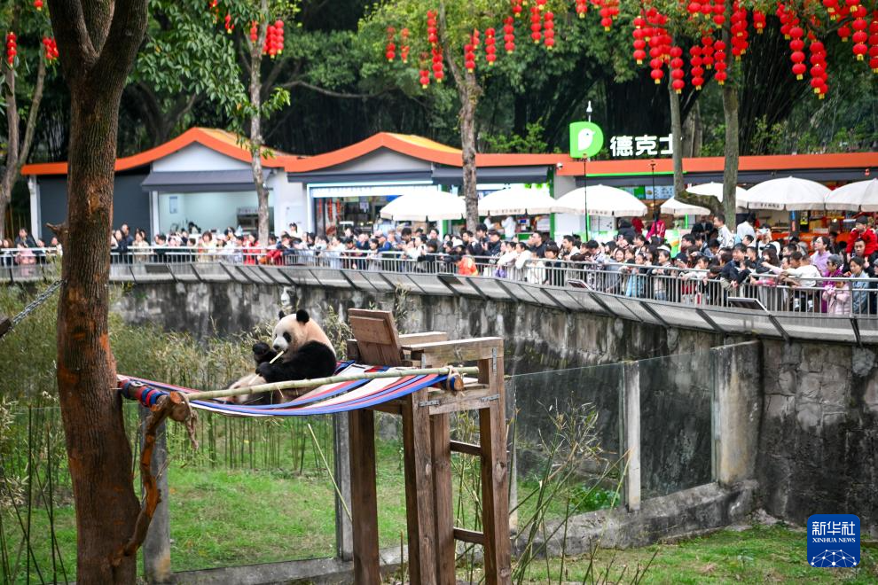 2月24日是丙午马年春节后的第一个工作日,但重庆动物园大熊猫馆热度不减,十几只大熊猫集体出舍,在暖阳下嬉戏,憨态可掬的模样吸引众多市民和游客前来观赏。