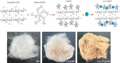 单宁酸与铜离子改性汉麻纤维的制备原理及外观形貌变化。受访者供图