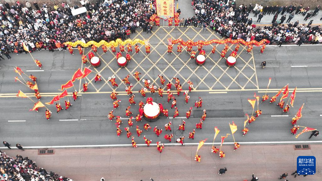 2月26日,民俗艺人在河北省灵寿县2026年新春民间艺术巡游展演活动中进行慈峪龙鼓表演(无人机照片)。
