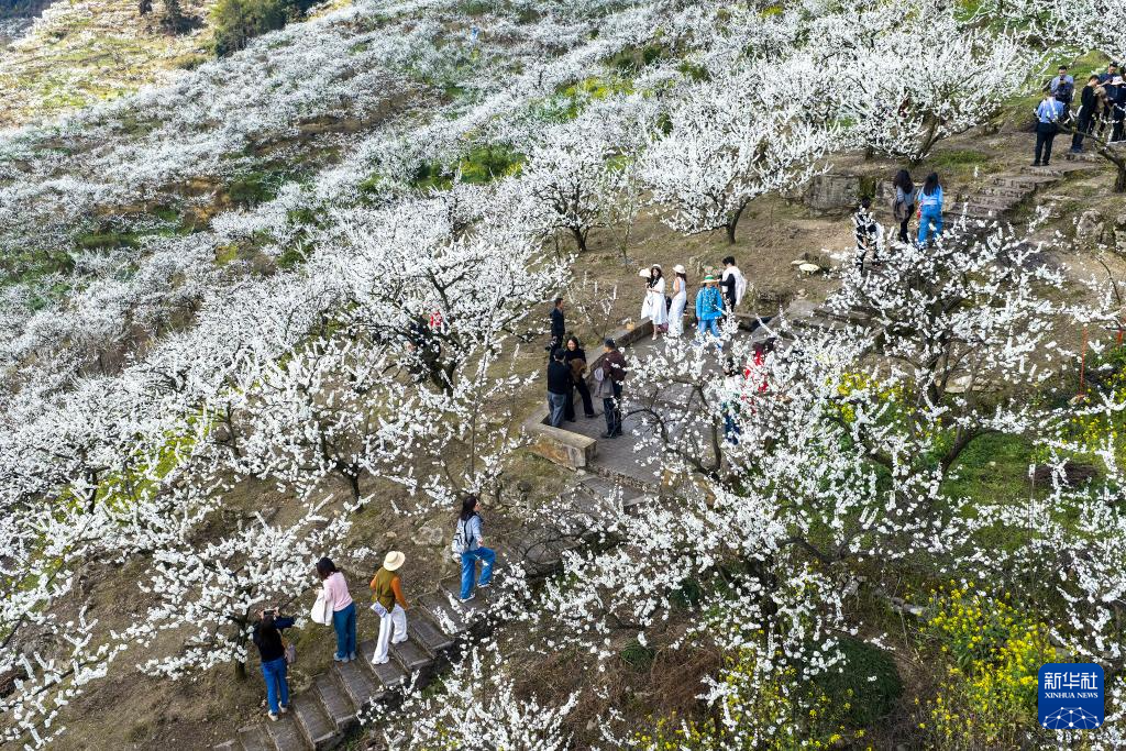 3月4日,游客在重庆市北碚区统景镇印盒李花生态旅游区游玩(无人机照片)。