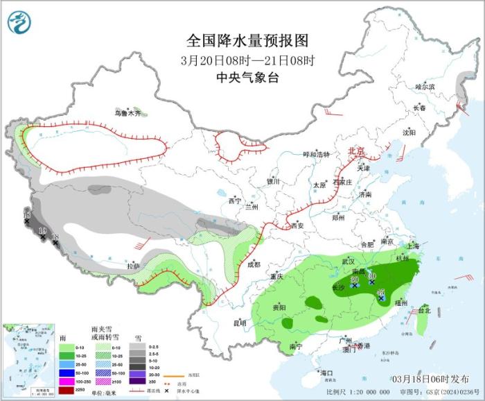 3月20日08时至21日08时,新疆南疆高海拔山区、西藏西部和北部、青海南部、甘肃南部、川西高原等地部分地区有小雪或雨夹雪,其中,西藏西部等地部分地区有中到大雪,局地有暴雪(10~19毫米);西藏东南部、江汉东部、江南、西南地区东南部、华南北部和西部、台湾岛等地部分地区有小到中雨,其中,江西中部、福建西部等地部分地区有大雨(25~45毫米)。内蒙古中部、辽东半岛等地部分地区有4~6级风,西藏北部部分地区有6~7级风;东海南部、台湾海峡等海域有5~6级风,阵风7级。
