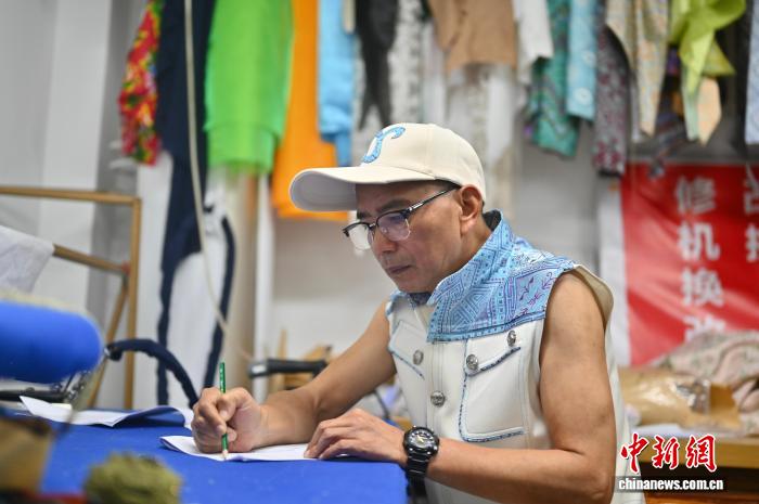 图为扬江诚为新款壮锦服饰绘制设计稿。俞靖 摄