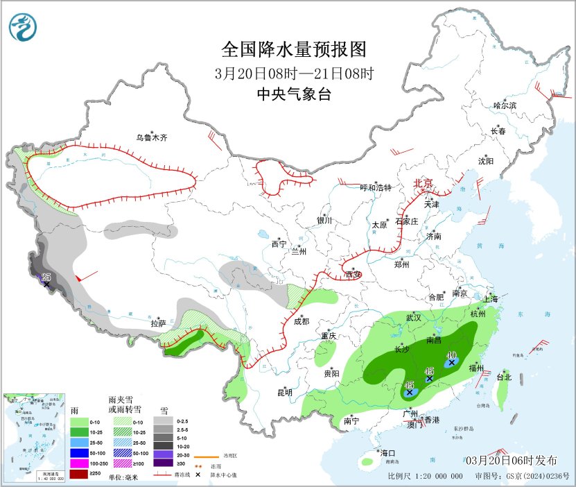 3月20日08时至21日08时,新疆南疆西部山区、西藏西部和南部、青海南部、川西高原北部等地部分地区有小到中雪或雨夹雪,其中,西藏西部等地部分地区有大到暴雪,局地大暴雪(20~25毫米)。贵州东部、江南大部、华南北部和西部、海南岛中部、台湾岛东部等地部分地区有小到中雨,其中,江西南部、福建西部、广东西北部等地部分地区有大雨(25~45毫米)。新疆东部、内蒙古中西部、黑龙江东部、辽东半岛、山东半岛等地部分地区有4~6级风,西藏南部部分地区有7~8级风;台湾海峡将有5~6级风、阵风7级(见图1)。