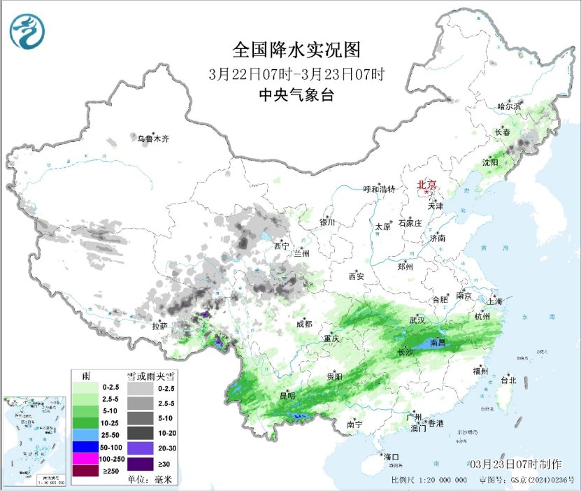 昨日,青海北部、甘肃中部和南部、川西高原北部、西藏中东部、吉林东部等地出现小到中雪或雨夹雪,江西中部、湖南东北部、贵州南部、广西北部、云南西部和南部等地出现中到大雨,云南南部等局地暴雨。