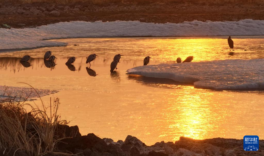 3月21日,候鸟在黑龙江省牡丹江市宁安市一处水域休憩(无人机照片)。