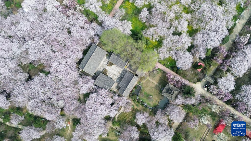 3月24日拍摄的河南省鄢陵县唐韵樱花园的樱花(无人机照片)。