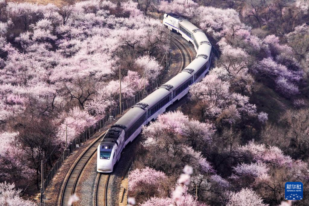 3月24日,一列客运列车穿行在北京市居庸关长城脚下的花海中。