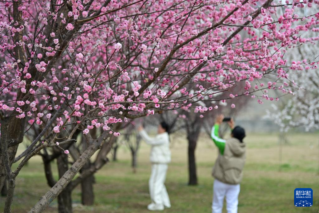 3月23日,游客在河北省石家庄市正定县南城门景区踏青赏花。