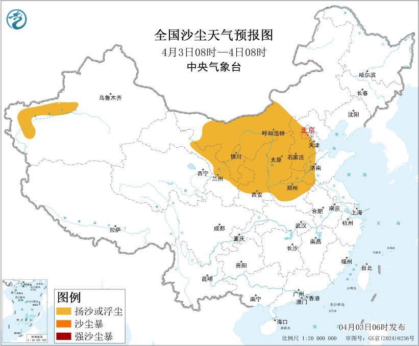 中央气象台4月3日06时继续发布大风黄色预警和 沙尘暴蓝色预警。预计,4月3日08时至4日08时,受蒙古气旋影响,内蒙古中东部、陕西中北部、山西大部、河北、北京、天津、河南北部、山东北部、辽宁大部等地部分地区有5~7级大风,阵风8~10级。受冷空气和对流共同作用影响,辽宁西部、河北东部、天津、山东北部、广西南部、广东北部等地局地有10~11级雷暴大风。渤海、渤海海峡、黄海北部海域、东海大部海域将有8~9级、阵风10~11级的大风(见图1);新疆南部、内蒙古中西部、甘肃中东部和河西、宁夏、陕西中北部、山西、北京西南部、天津西部、河北中南部、河南中北部、山东西部等地的部分地区有扬沙或浮尘天气(见图2)。