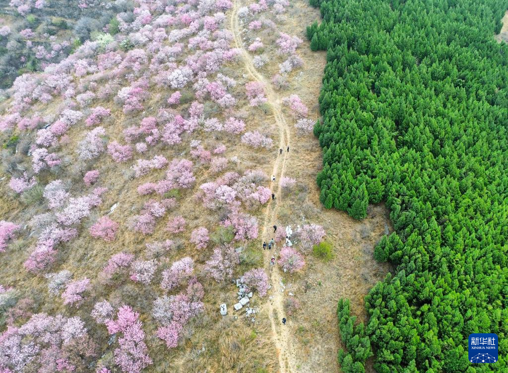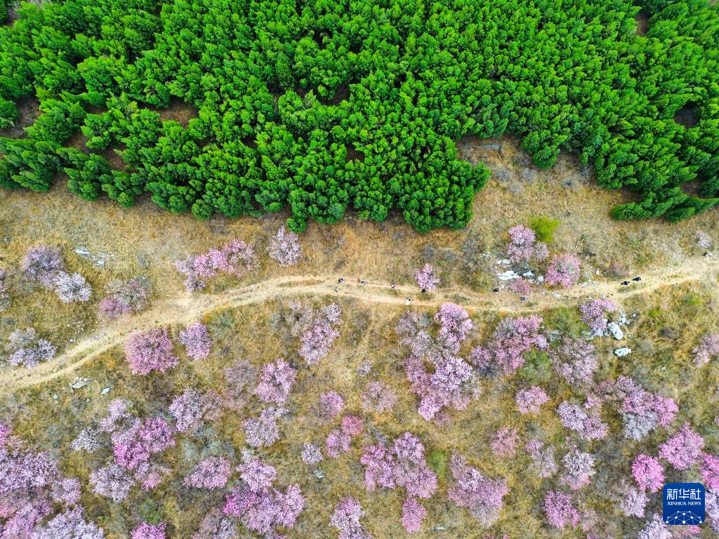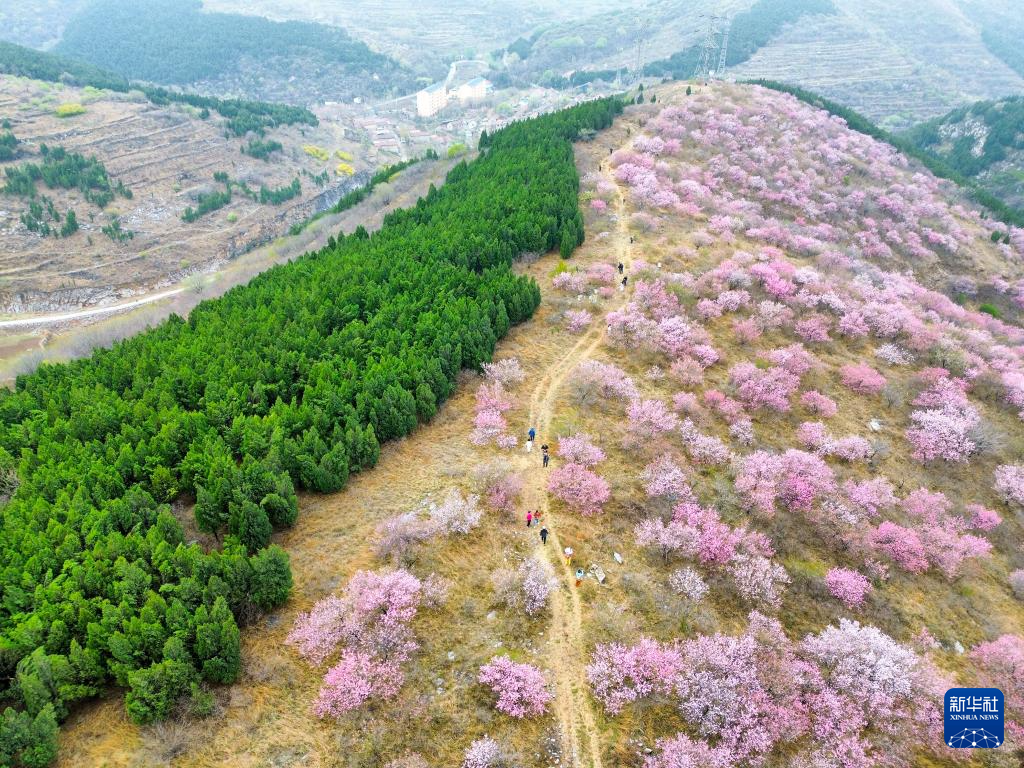 4月9日,游人在山东省淄博市博山区石马镇上焦村桃林赏花游玩(无人机照片)。