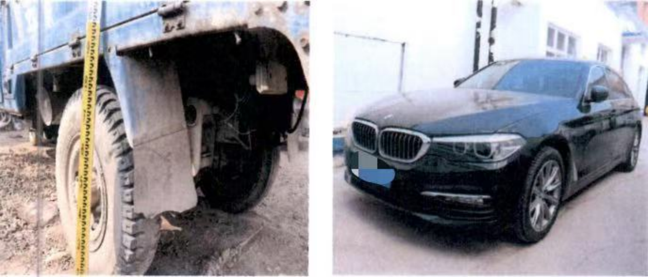 △被撞的三轮汽车(左)和打远光灯的小型轿车(右)