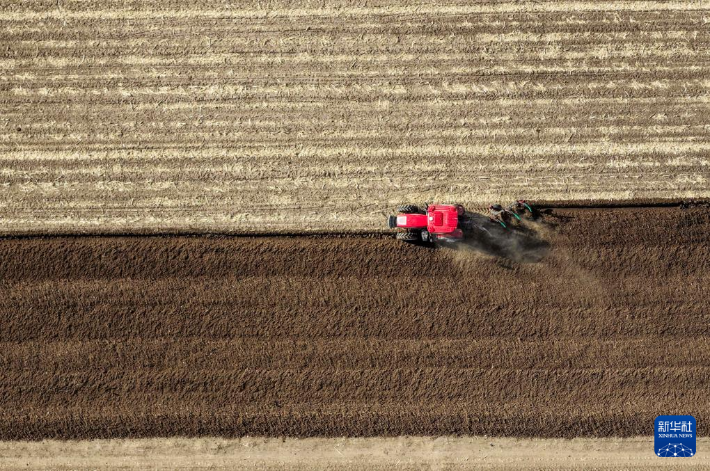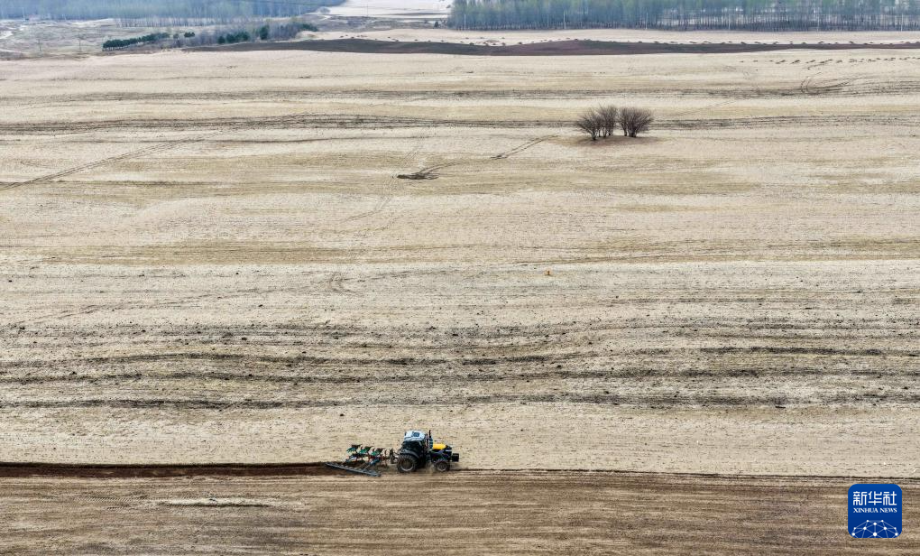 4月17日,在通辽市科尔沁左翼中旗花吐古拉镇,农机手驾驶农机翻地(无人机照片)。