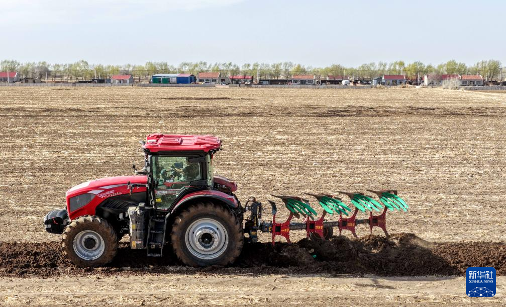 4月17日,在通辽市科尔沁左翼中旗花吐古拉镇,农机手驾驶农机翻地。
