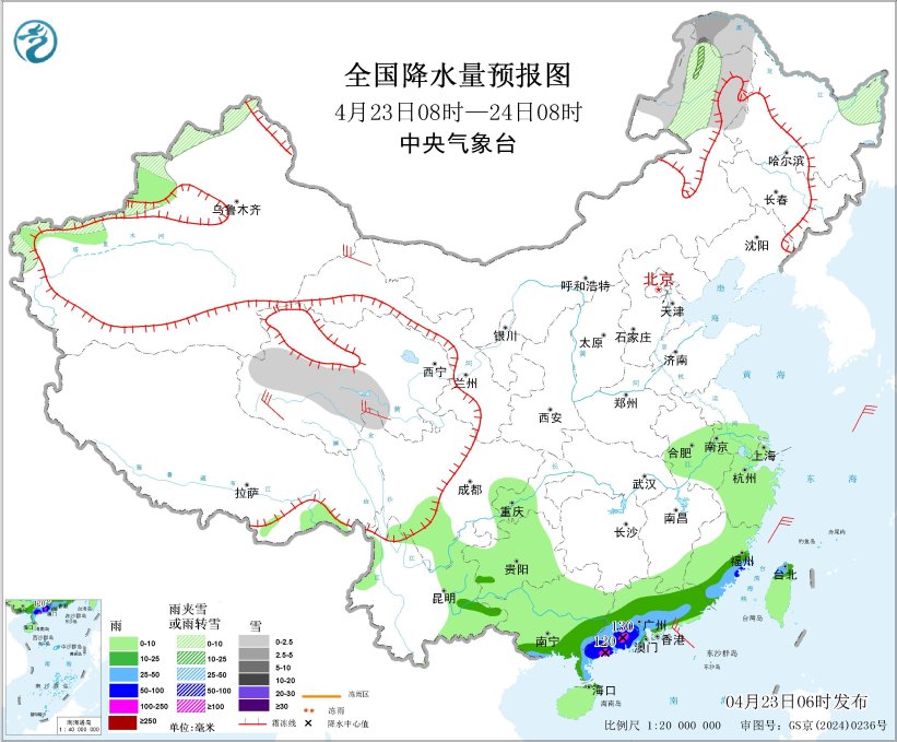 4月23日08时至24日08时,内蒙古东北部、黑龙江北部、新疆北疆北部和南疆西部山区、青海南部等地部分地区有小雪或雨夹雪,其中,内蒙古东北部、黑龙江西北部等地部分地区有中到大雪;福建东南部、广东中南部、广西东南部、台湾岛北部等地部分地区有中到大雨,其中,福建东南部、广东西南部等地部分地区有暴雨或大暴雨(100~130毫米)。青海中西部、甘肃河西、川西高原北部等地部分地区有4~6级风(见图2)。
