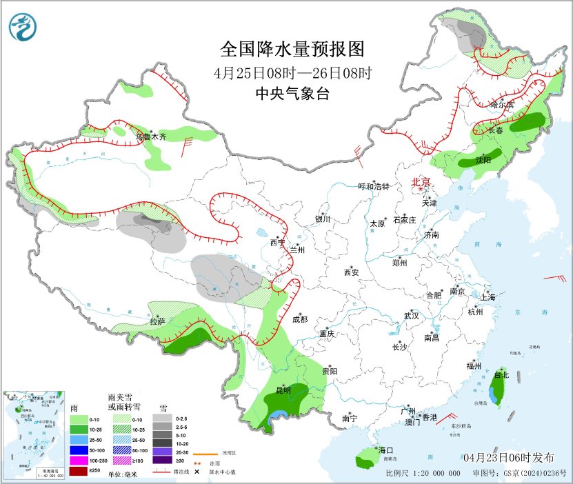 4月25日08时至26日08时,内蒙古东北部、黑龙江西北部、新疆南疆西部山区、青海西部和东南部、西藏中部、川西高原北部等地部分地区有小到中雪或雨夹雪;东北地区中南部、西藏东南部、云南、海南岛、台湾岛等地部分地区有小到中雨,局地有大雨。内蒙古中部、新疆东部等地部分地区有4~6级风(见图4)。