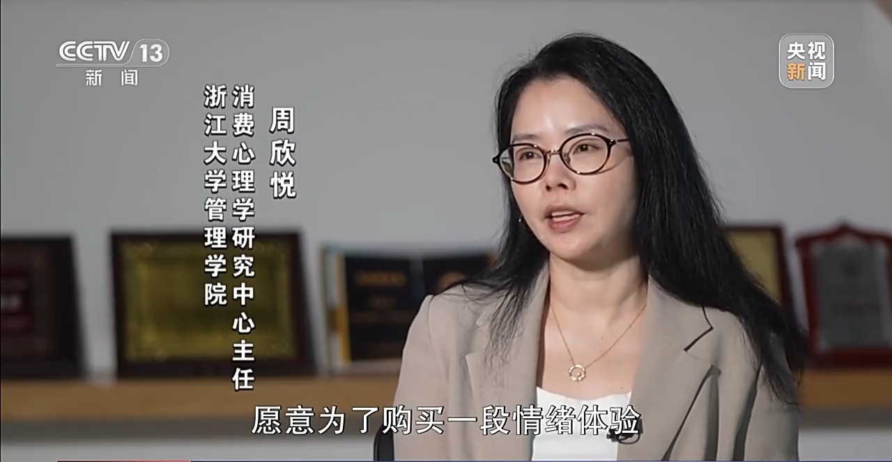 浙江大学管理学院消费心理学研究中心主任周欣悦:情绪消费其实是消费者愿意为了购买一段情绪体验,而进行的消费行为,而且愿意去支付溢价,也就是愿意额外再多花钱。我们消费者的关注点,从外部物质世界转换到内心精神世界的这样一个过程。