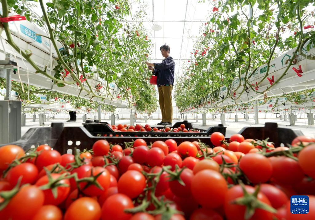 4月27日,农民在河北省卢龙县木井镇蔬菜种植基地的大棚内采摘西红柿。