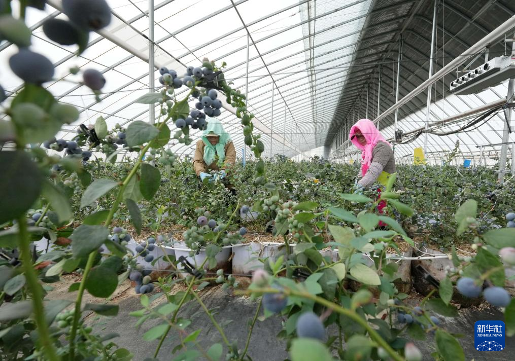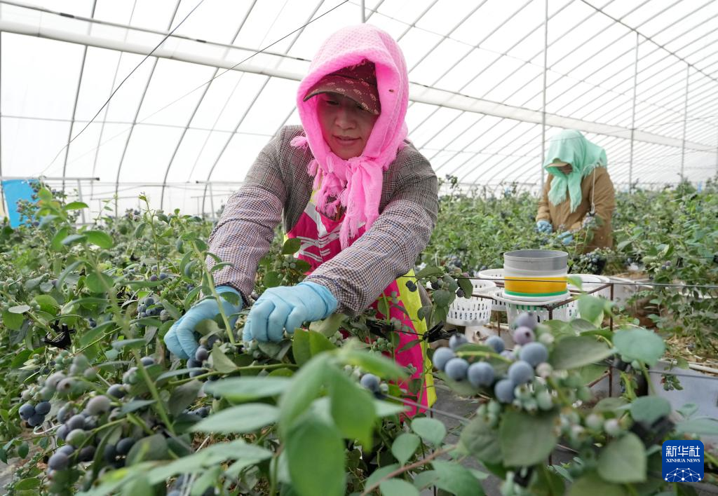 4月27日,河北省卢龙县胜行家庭农场的工人在大棚内采摘蓝莓。