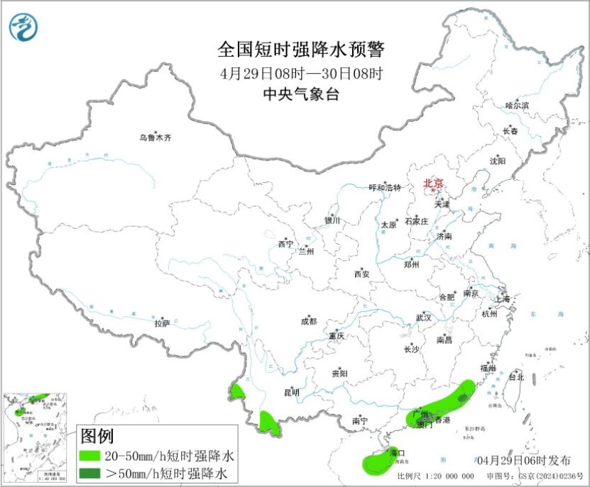 4月29日,江南东部、华南中东部和南部等地部分地区有中到大雨,局地暴雨。预计4月29日08时至30日08时,广东中南部、海南岛西南部等地的局地将有8级以上雷暴大风或冰雹天气;华南东南部、西南地区西南部等地的部分地区将有小时雨量大于20毫米的短时强降水天气,其中,广东中南部和西南部沿海等地的局地小时雨量大于50毫米,最大可达60毫米以上(见图1)。预计,强对流的主要影响时段为今天白天。 中央气象台4月29日06时继续发布强对流天气蓝色预警